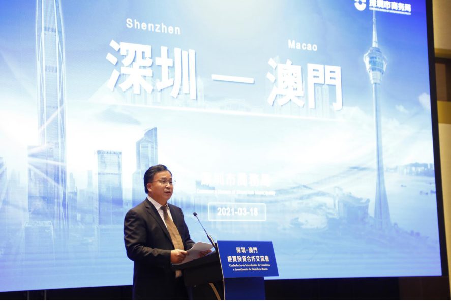 深圳市商務(wù)局局長王有明在交流會上重點(diǎn)介紹了深圳建設(shè)中國特色社會主義先行示范區(qū)的機(jī)遇、抵御風(fēng)險(xiǎn)和挑戰(zhàn)的韌性、構(gòu)建全過程創(chuàng)新生態(tài)鏈以及“引進(jìn)來”“走出去”參與全球經(jīng)濟(jì)等情況,并鼓勵澳門同胞們、企業(yè)家們共同抓住國內(nèi)大循環(huán)和國內(nèi)國際雙循環(huán)的新發(fā)展格局,助力粵港澳大灣區(qū)的發(fā)展。深圳市南山區(qū)委書記曾湃表示,南山是中國經(jīng)濟(jì)發(fā)展質(zhì)量最好、頂尖企業(yè)最多、科技創(chuàng)新氛圍最濃、綜合營商環(huán)境最優(yōu)的城區(qū)之一,未來也將繼續(xù)深入推進(jìn)與澳門在經(jīng)貿(mào)往來、產(chǎn)學(xué)研合作、青年創(chuàng)新創(chuàng)業(yè)等方面的交流互動,促進(jìn)優(yōu)勢互補(bǔ)、協(xié)同發(fā)展。澳門貿(mào)易投資促進(jìn)局執(zhí)行委員余雨生在致辭中表示,希望兩地在“深澳合作會議”機(jī)制框架下,在中醫(yī)藥研發(fā)制造、金融、高新技術(shù)和會展商貿(mào)等產(chǎn)業(yè)方面加大合作力度。澳門貿(mào)易投資促進(jìn)局執(zhí)行委員余雨生致辭